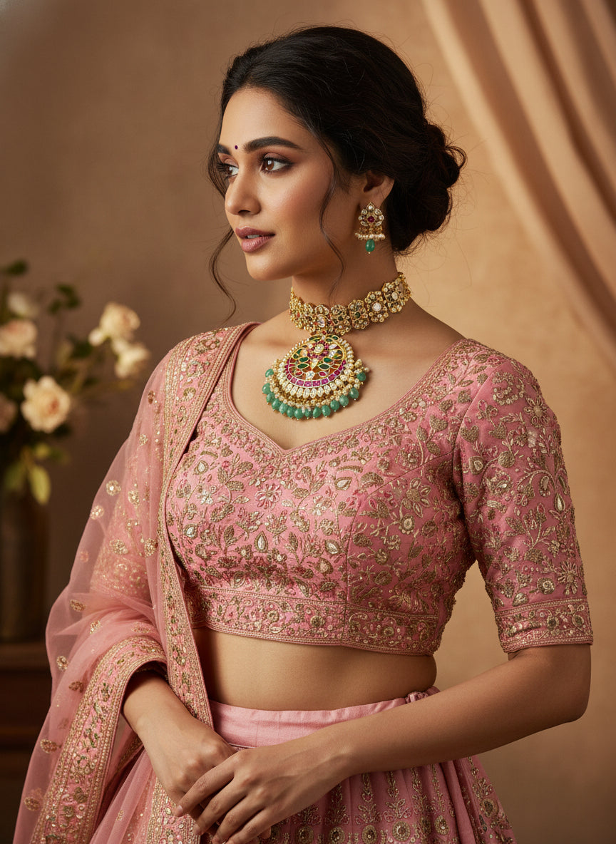 Enhance your jewelry collection with the Divyaroop Jadau Kundan Chokar / Hasli and experience the perfect marriage of beauty and craftsmanship. Order yours today and transform any outfit into a stunning ensemble!