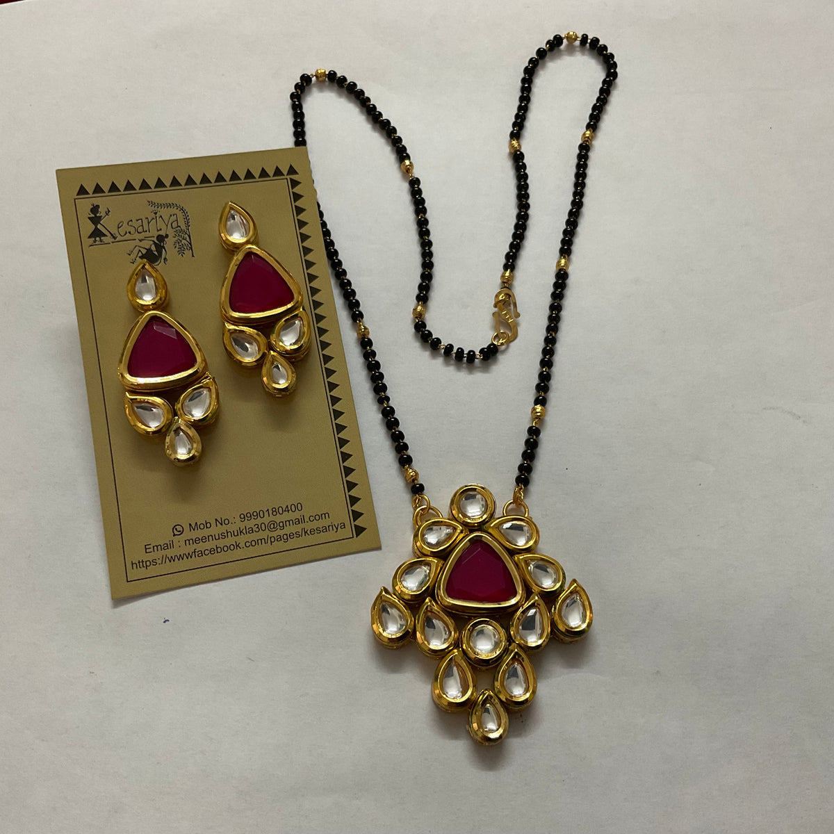 dimension:"20-inch Beautiful Kundan Mangalsutra and earrings, designed to gracefully drape below the neckline, offering a regal and sophisticated look."