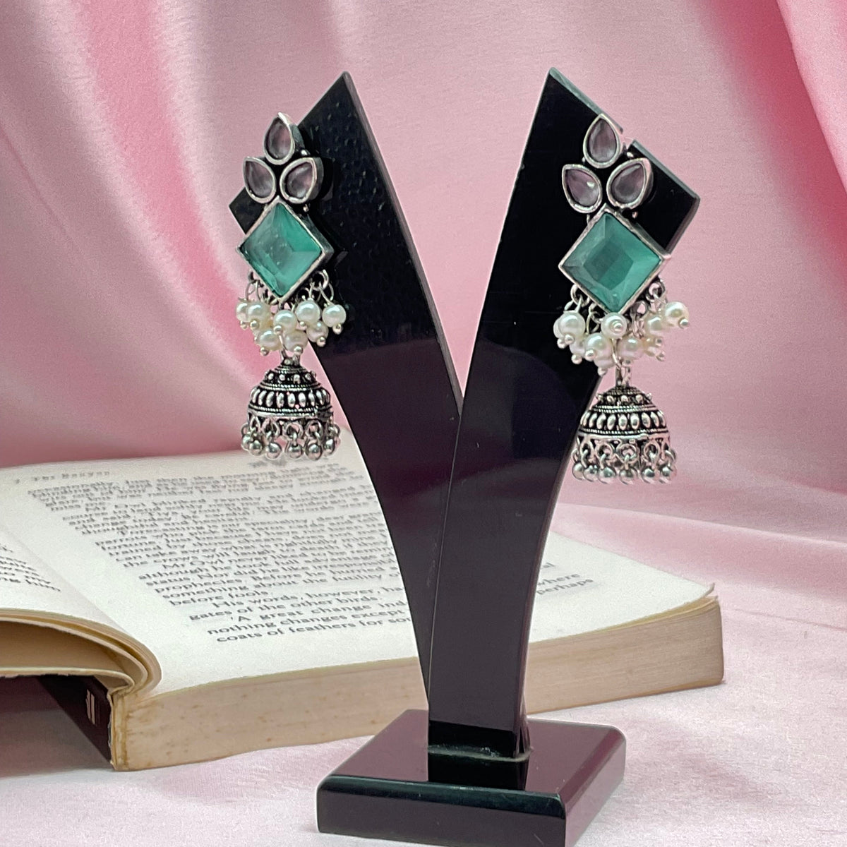 indian girl wearing ethnic attire in her 20 s ,wearing jhumkis in silver oxidized jhumkis ,hair tied ,makeup done for party